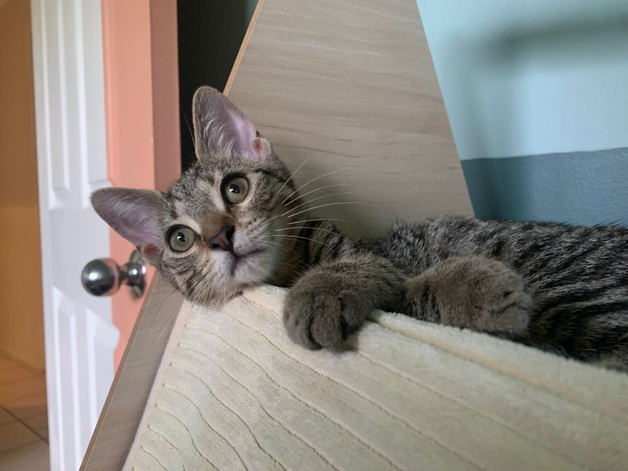 Willow is extremely sweet and on average is very relaxed, even for a kitten! She of course has spurts of energy, and loves any toy on a string, her main goal at the moment is to snatch it from you and carry it around the house with her!