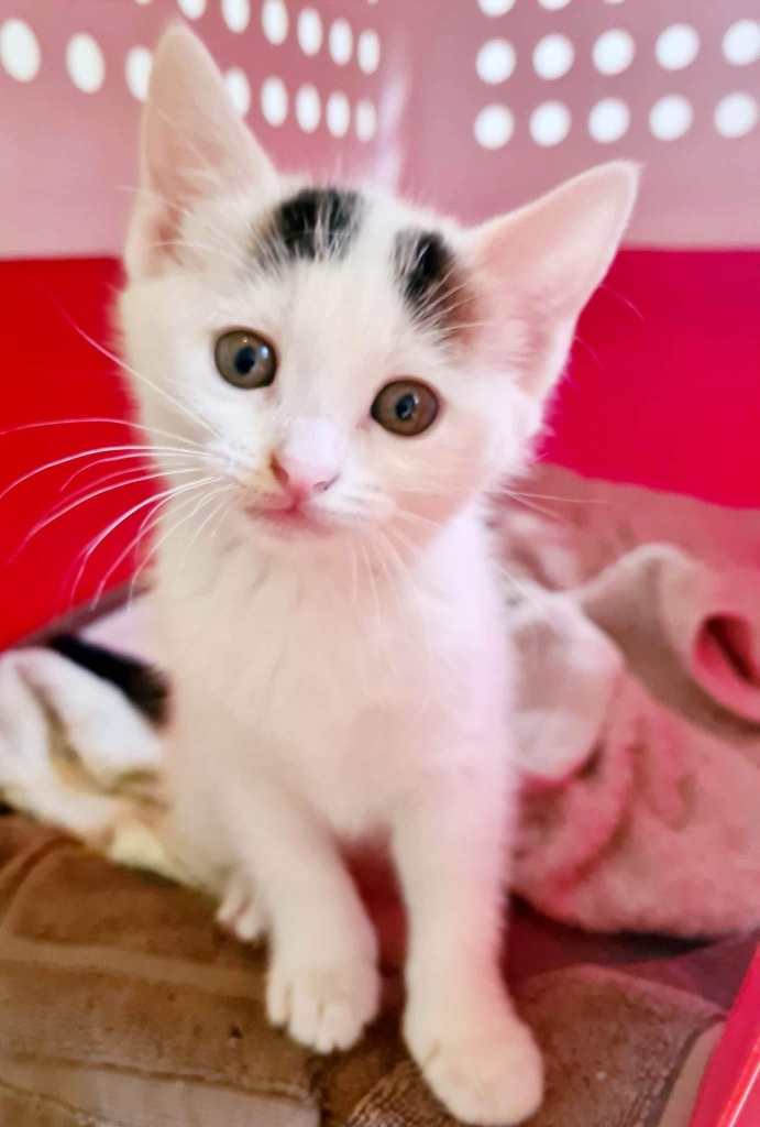 Oh how Rigby melts hearts - so many dots - so much white - swoon!! Yet to be formally identified as a male or female - Rigby came into care with Mumma cat Flame and siblings Cinder and Tootles. Happy, rambunctious, curious kittens who love a rough and tumble with one another.