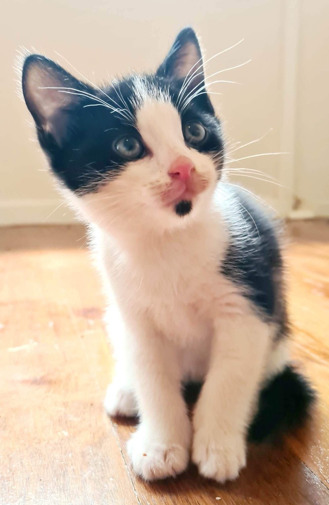Hi I'm Tootles - black, white and complete with a little goatee - I am super cute and cuddly. My sex is still unknown and will be updated if I am a girl. I came into foster care with my mum Flame and 2 siblings Cinder and Rigby. We are in really good condition and mum is still feeding us. Kitten energy - looking for a feline friend or adopted with a sibling to keep me company!!