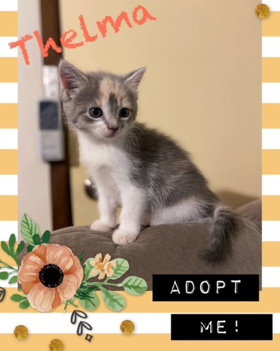 Thelma is a spunky and curious kitten who loves to explore the world around her. She’s not afraid to take on new challenges, whether it’s a puzzle toy or an unfamiliar face. Thelma is also quite playful and loves to chase after toys or race around with her siblings. But when the playtime is done, she loves nothing more than cuddling up in your lap for some TLC. Thelma is full of love and affection for those who show her kindness and she can’t wait to find her forever home!