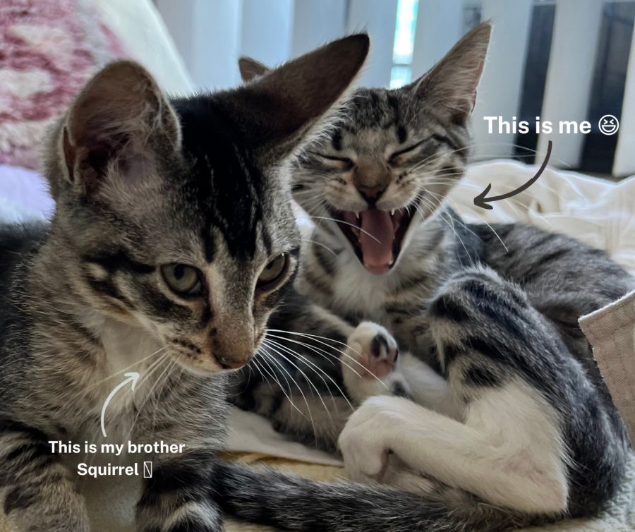Our charming boy, Squirrel, and he'll keep you entertained with his playful antics and SUPER affectionate nature, loves to play-wrestle with his sister; he's full of energy and fun. When Squirrel is ready to take a break, he'll come over for some snuggles and pets.