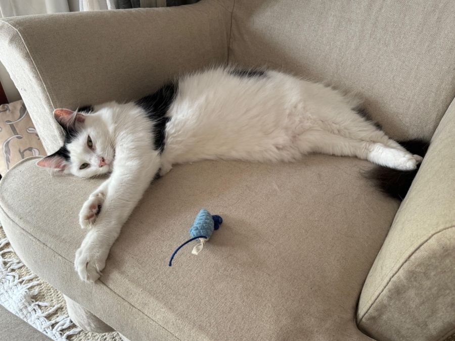He is a great cat to have for company and he potters around the house and will mainly hang out in the same room as you. He is a fun and quirky cat who will make his way into your heart. He is really good with kittens, as he has been fostered with many little kitties over the last twelve months. He has been very affectionate to them, and they like to play and cuddle up together. His favourite spots are sitting in the sun by the window watching the world go.