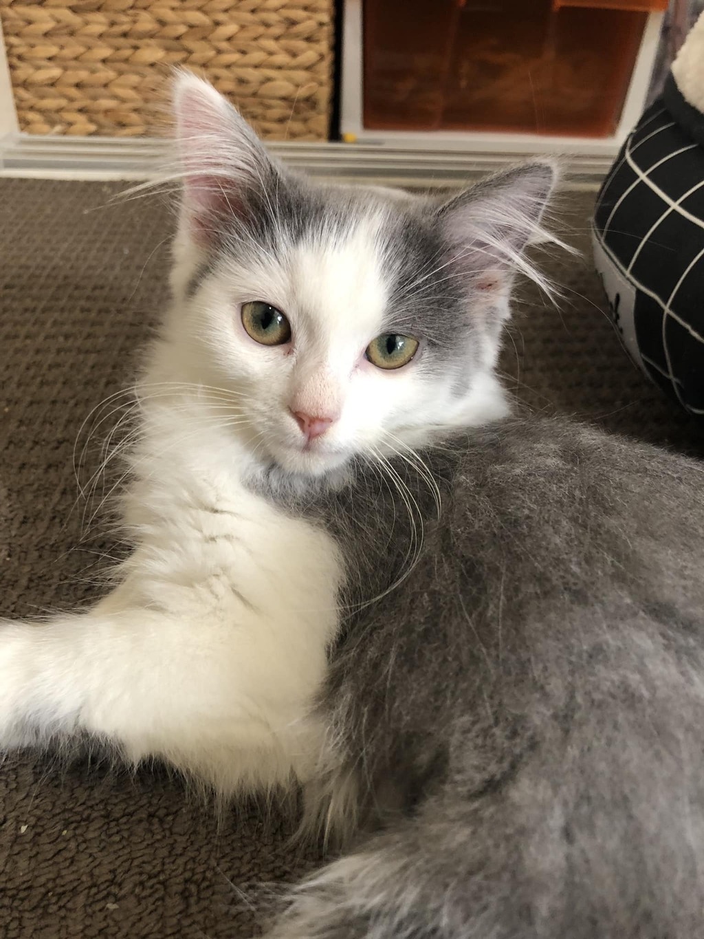 Buttons likes to feel close to people and animals, but she doesn't like being held or left alone. She'll often shadow you quietly from behind wherever you go in the house. On top of that, she can use crystal (gel) litter without issue - making things much easier for her owner.