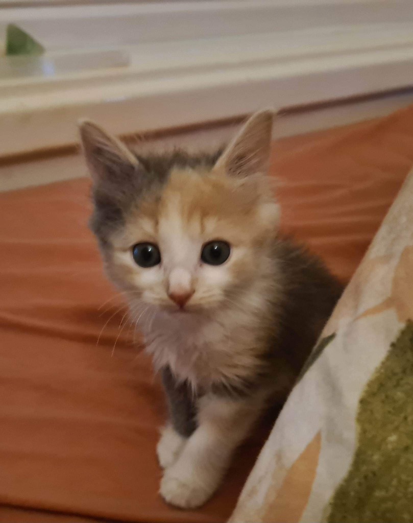 Meet our Itty Bitty Quinn. A striking medium haired white torti - she has lovely greys and gingers through her coat and such a sweet face. Found with sister Peyton hiding underneath a trailer and in the gravel - both girls were covered in dirt and had ringworm scabs - they have been treated and are now all clear. Bring a longer haired kitty, Quinn will require daily brushing to keep her coat in tip top condition and this helps foster a bond with owner and kitty. A lovely little kitten who is regularly held and washed and used to human and older resident and foster cats. Deserving of a lovely family to call her own or to share with sister Peyton.