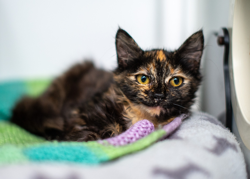 Becca is an adorable little black tortoiseshell girl. At only 4 months old, this quiet little girl is ready to find her new home with your loving family. Becca can be a bit more quiet in the beginning, but once she warms up to you, she purrs, leans into all your pats, and just loves treats.