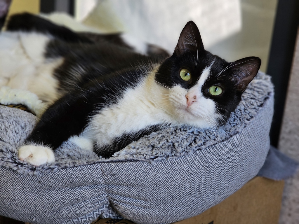 Findley, in new places, can be a bit of a scaredy cat to start with; but give her time and she will become the ultimate lap cat. Once you've gained her trust she will smooch into your hand, rub against your legs, and lay on your lap napping away for hours.