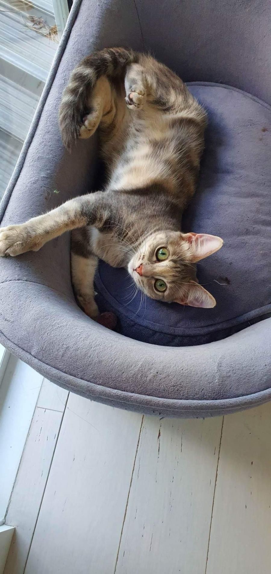 Thanks to her amazing foster carer Winnie is a more confident and relaxed kitten who just loves to lounge around and enjoys her playtime and pats.
