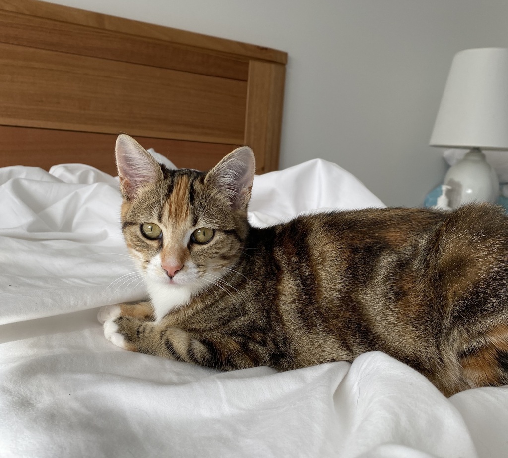 Meet April! April is a very friendly rescue pet who loves to be held and purrs non-stop. She is an outgoing little girl who loves exploring and joining in on playtime with her people. During nap time, she can usually be found cuddling up with her sisters. April also loves scratching her mat and pole for some extra fun playtime.