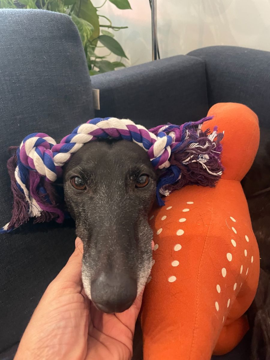 My hooman says I'm smaller and bouncier than most greyhounds, more like a big whippet! I looove attention, and I think I'm one of the most sociable and affectionate pups around! My response to a backrub is something you HAVE to see – mega wriggles and bounces!