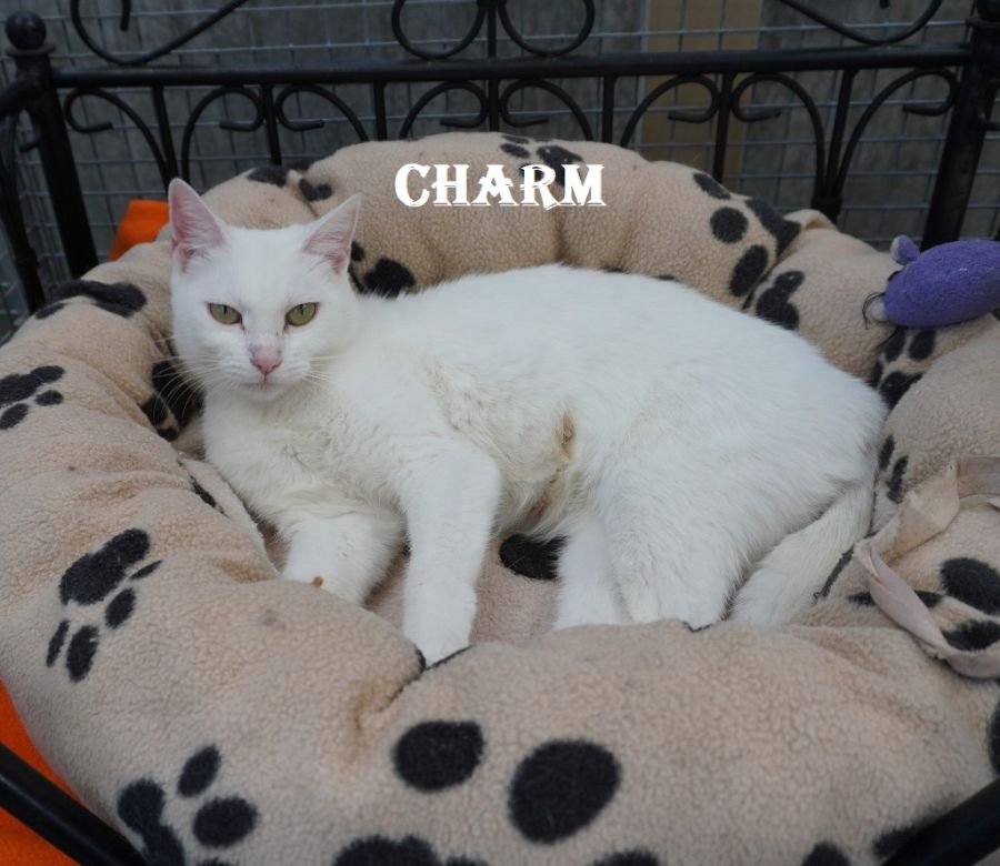 Charm is a beautiful cat with lots of love to give. She likes her cuddles and likes her pats and I am sure she wants to just sit on someones lap forever.