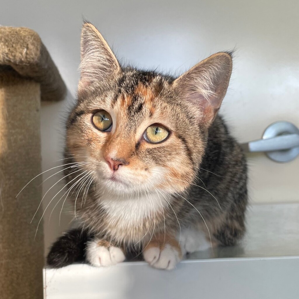 Oprah Whisker is an adorable kitten looking for her forever home! She may be shy at first, but she warms up quickly and loves to play. She loves to chase after balls and toys, and can often be found snuggled up with another kitten in the shelter. Oprah is good with other cats and would make a great companion.