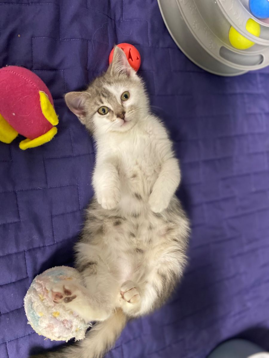 Sugar is a 10 week old male Grey & White Tabby Domestic Short Hair Kitten who is full of sweetness and purrs. He loves to play with his brother Spice, but can be shy at first when meeting new people. Despite being unwell recently, he has bounced back to full health and is now ready to find his forever home.