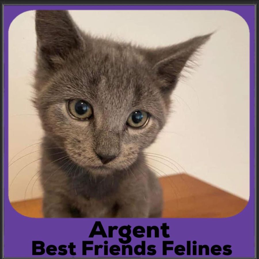Argent is one of those shiny happy kittens that you sometimes meet. His playful banter and love of tickling his carer’s feet is readily evident; he loves to play and tumble about with his siblings (especially his brother Slate). Argent adores playing with fluffy toys on a stick and a ball with a bell in it, and will bounce about playing before settling down for a nice dinner and a cuddle. Never one to turn down a morsel of roast chicken as a treat nor a cuddle and scratch behind his ears, Argent is sure to waltz right into your heart and make himself comfortable.