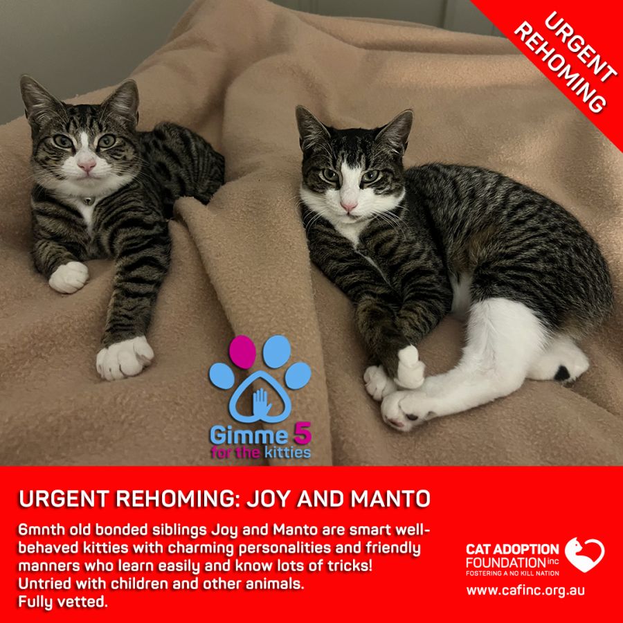 Donate to Joy and Manto Private Rehoming No Charge! at Cat Adoption Foundation Incorporated via Shout