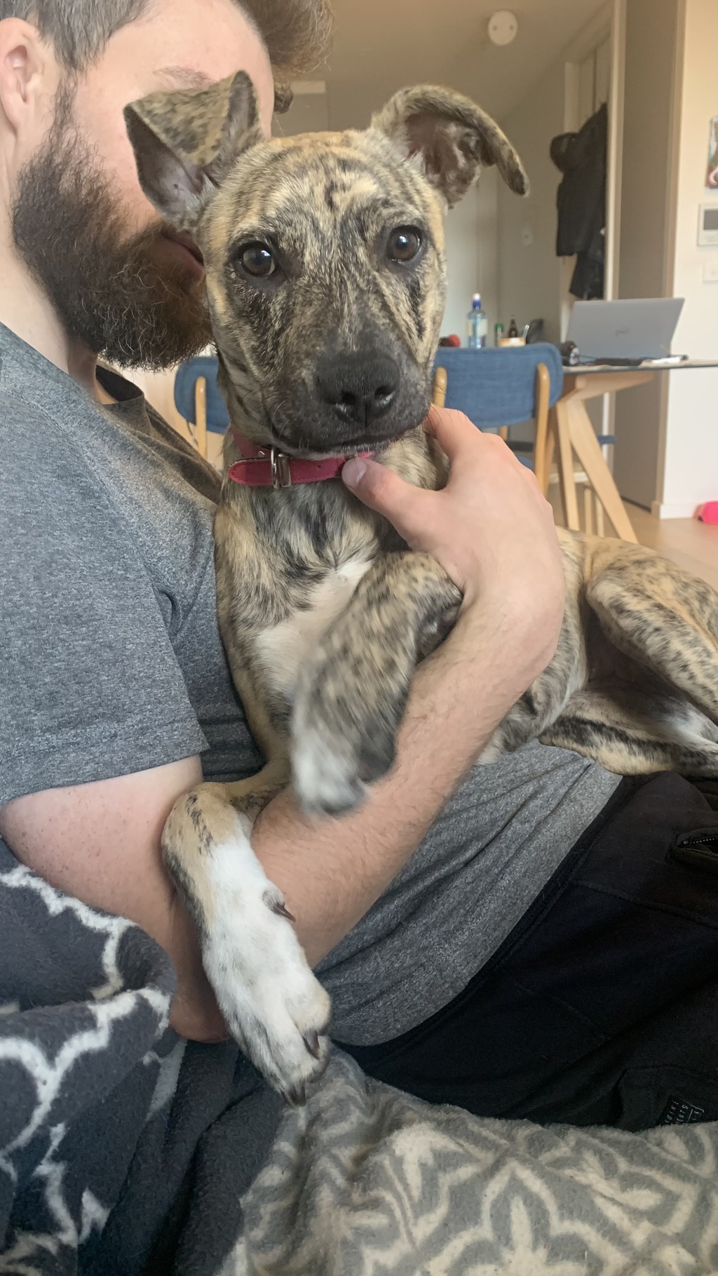 I really enjoy going for long walks and being in nature with my people, being a part of the family activities really makes me happy (and I travel well in the car too)! I also love to play, tug-o-war is one of my favourite games to play with my people. After a good playing session I enjoy cuddling up with my people while they watch a good movie or series (if there is a treat involved for me I will be even happier)!