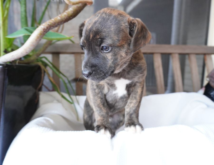 We do not know what breed Enzo is but he is a handsome boy and full of typical puppy exuberance. He is very friendly and confident - and can be a little bit adorable!
