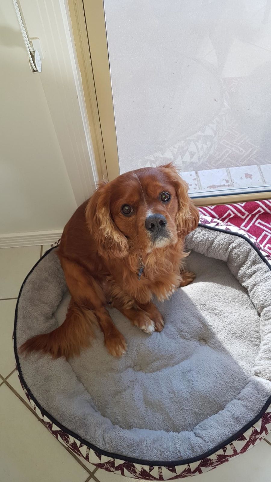 He is a real couch potato – takes up most of the space! He gets on exceptionally well with other dogs, he doesn’t have a mean bone in his body, according to his carer. He has many of the Cavalier traits – is placid, easy-going, friendly and exuberant.
