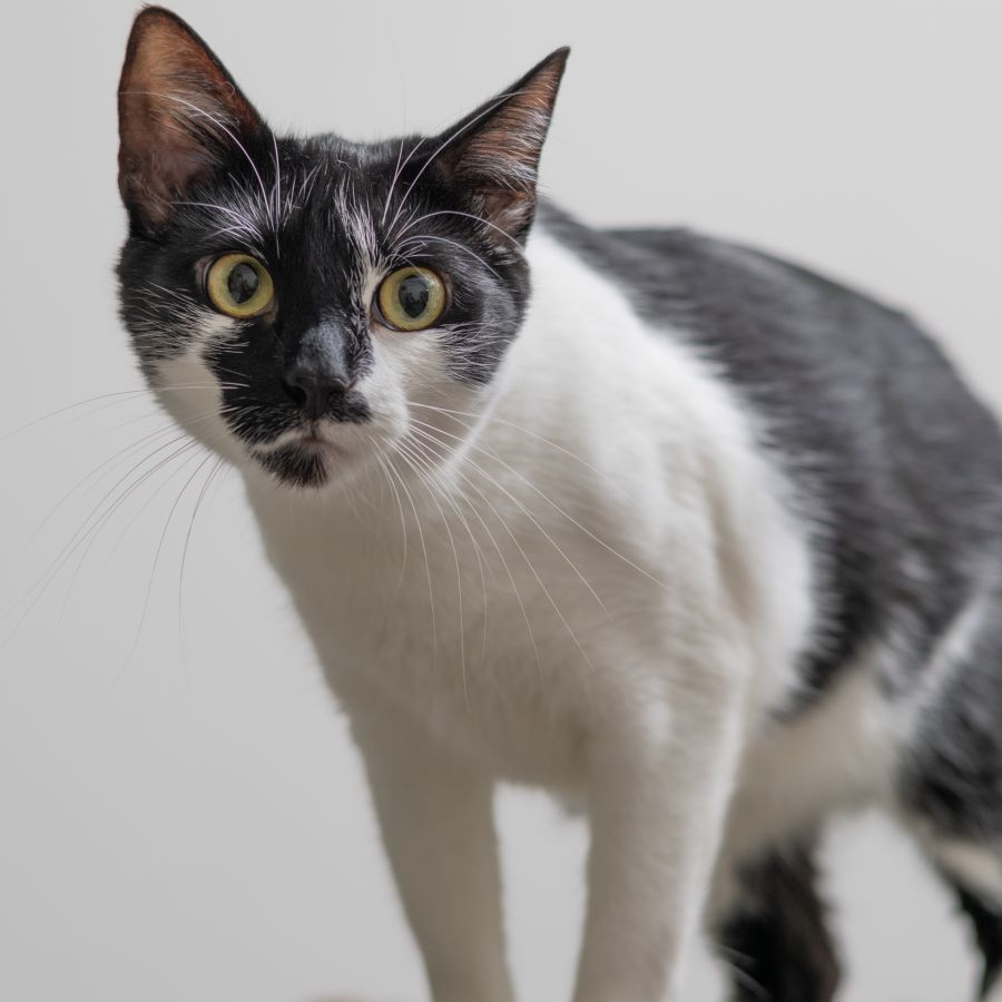 Allow me to introduce you to the captivating black and white beauty, Darcy. This mama cat possesses a heart of pure sweetness and adores the company of people. With her comforting presence, she makes an excellent listener and delights in curling up in your lap for a cozy nap.