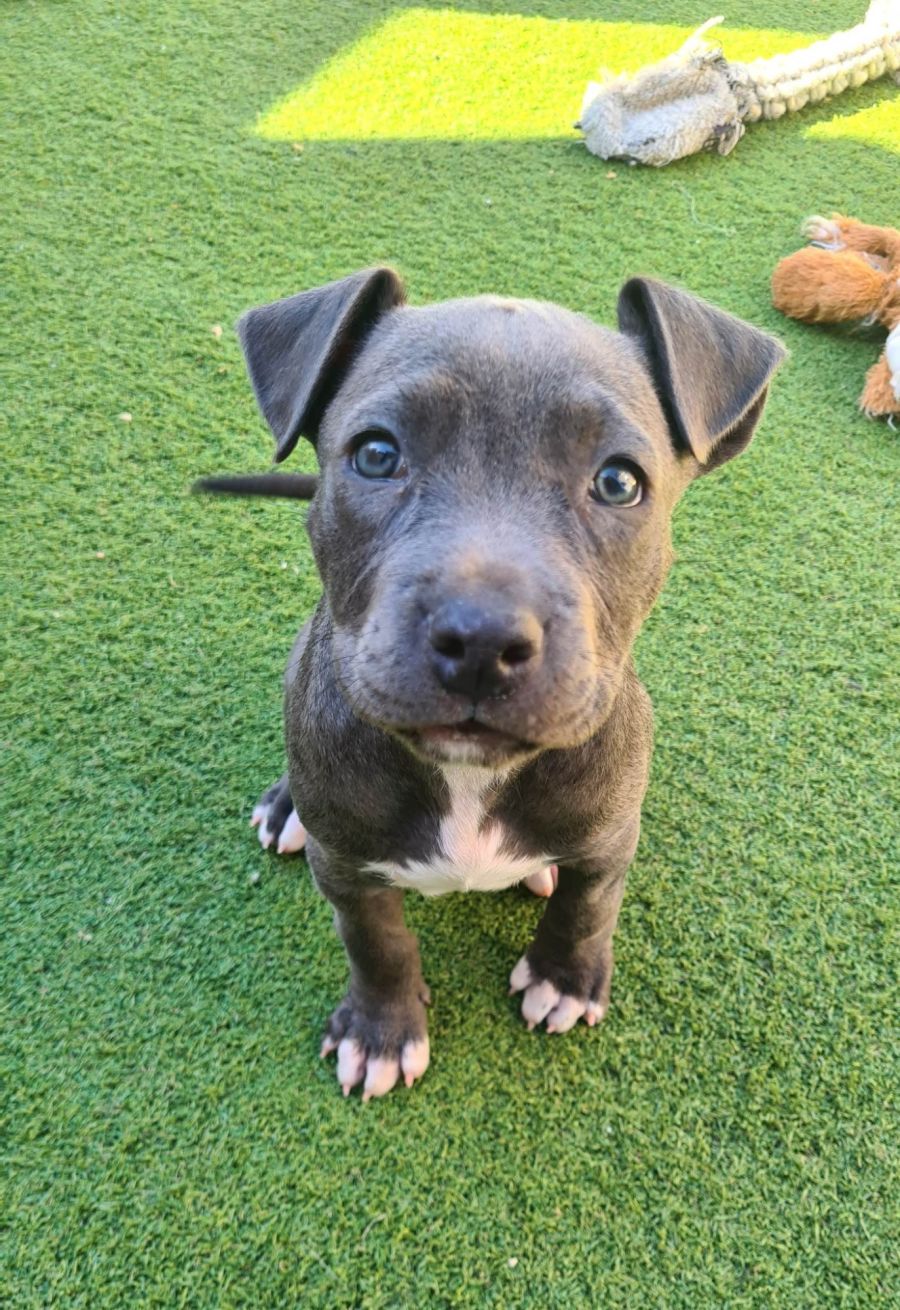 This gorgeous stunner is Octavia! She has a beautiful blue coat and pretty white markings that will make people turn their heads wherever she goes. Octavia is a loving and affectionate puppy who loves cuddle time with her people. She will snuggle in your lap or up alongside another dog. In the yard she likes exploring as she is very inquisitive about new things. Octavia loves a good game of tug of war and a good romp with a doggy friend.