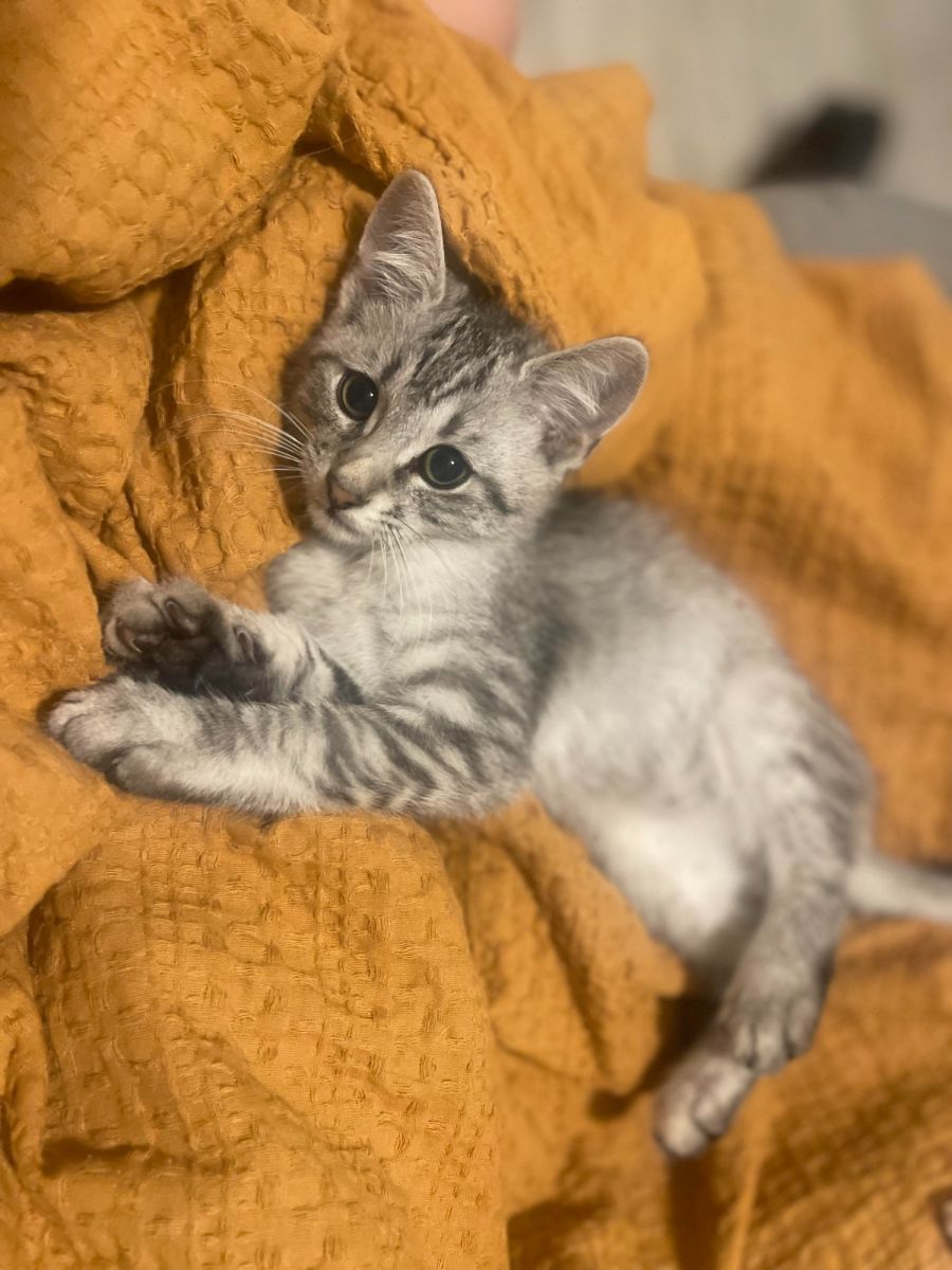 Merlin is an adorable silver tabby with a charming personality. He thrives on affection, and his favourite pastimes include cuddling and playing. Merlin is a highly social cat who enjoys interacting with humans and other animals. His playful nature brings joy to any environment, and he will quickly become a beloved member of your family.
