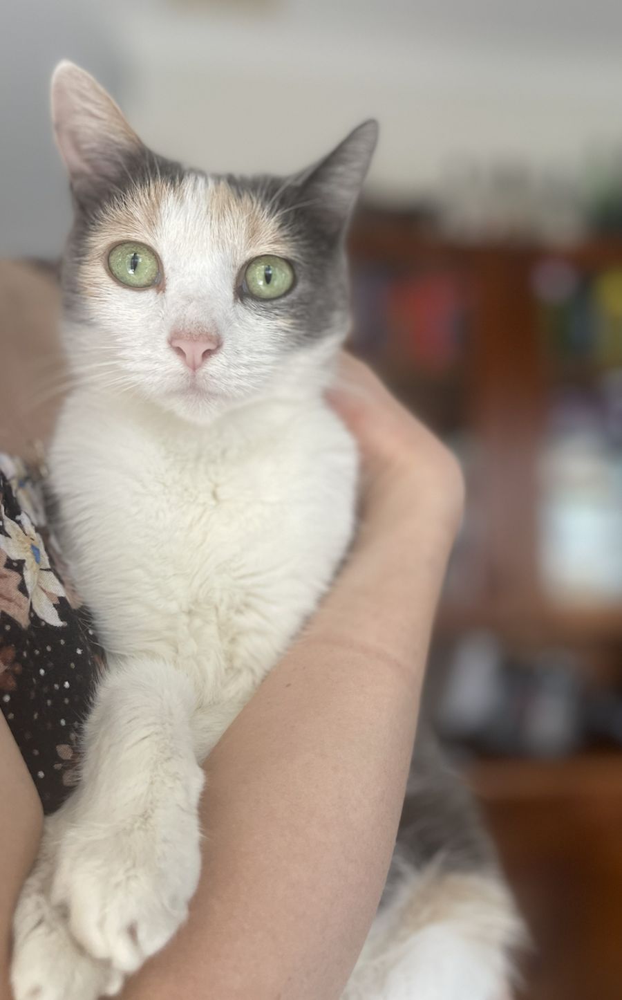 Pocahontas is a beautiful calico cat with a stunning coat and perfect personality. Her expressive face is always filled with warmth and curiosity, perfectly matching her gentle and sweet nature. Pocahontas is always ready to shower her humans with love and affection, purring contently as she seeks cuddles and companionship. Despite her timidity around other cats, she forms a strong bond with her human caregivers and brings joy to their lives.