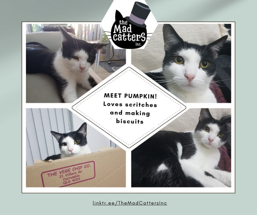 "Hey there, I am Pumpkin, and I am young and ready to start my life. You see, I was found on the streets, pregnant and alone. I was so lucky that the Mad Catters found me, and gave me warmth and comfort to give birth and raise my 5 little babies. I loved being a mother, but it was hard work!