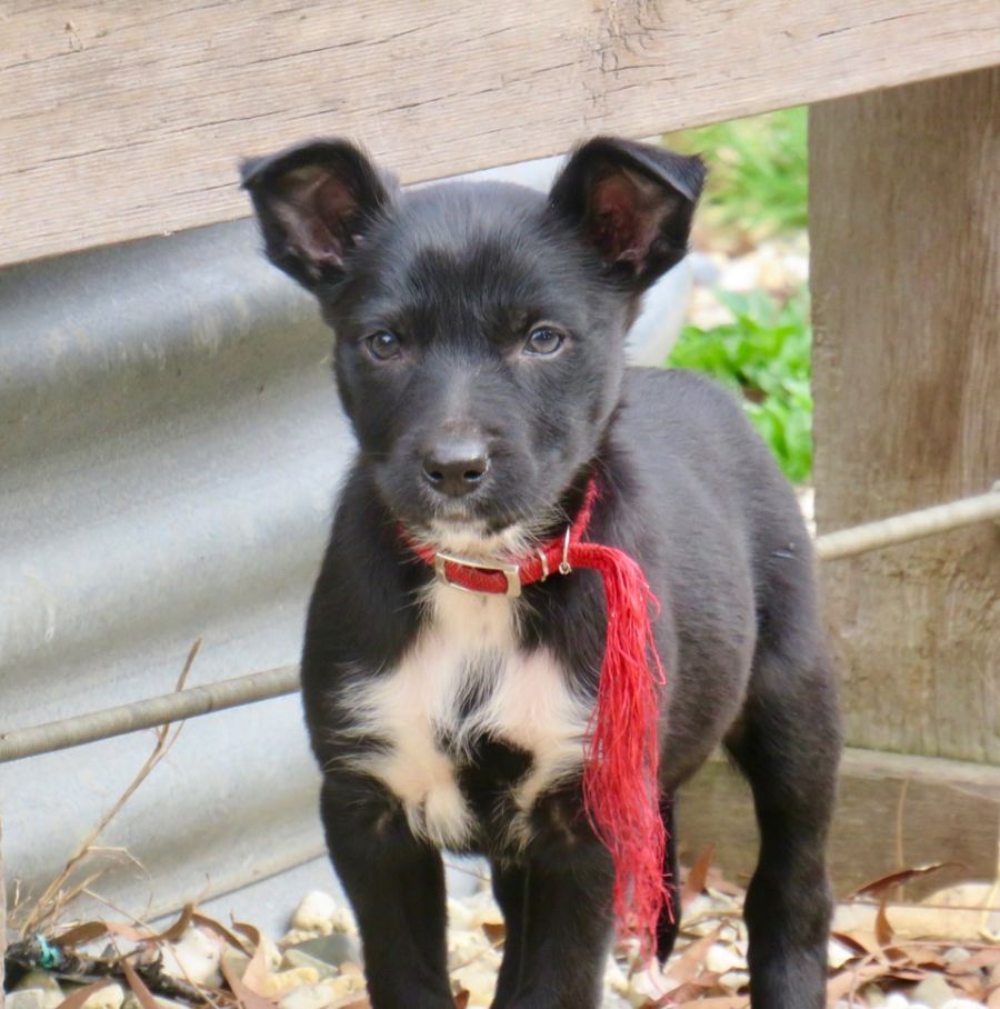 Elm is a black and white Kelpie puppy female who is intrigued by everything. She is the first to come when called at meal times and is very keen on cuddles!