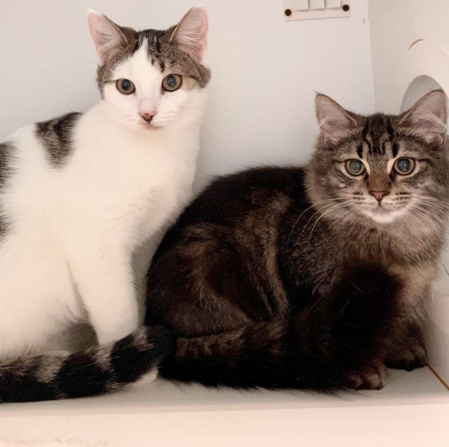 Angel and Narnia a bonded pair of 7-month-old kittens. Narnia is the white tabby, whereas Angel is the medium haired tabby who is currently the more affectionate and rather partial to a cuddle. Like most kittens, the pair are curious, playful and adventurous and lots of fun.