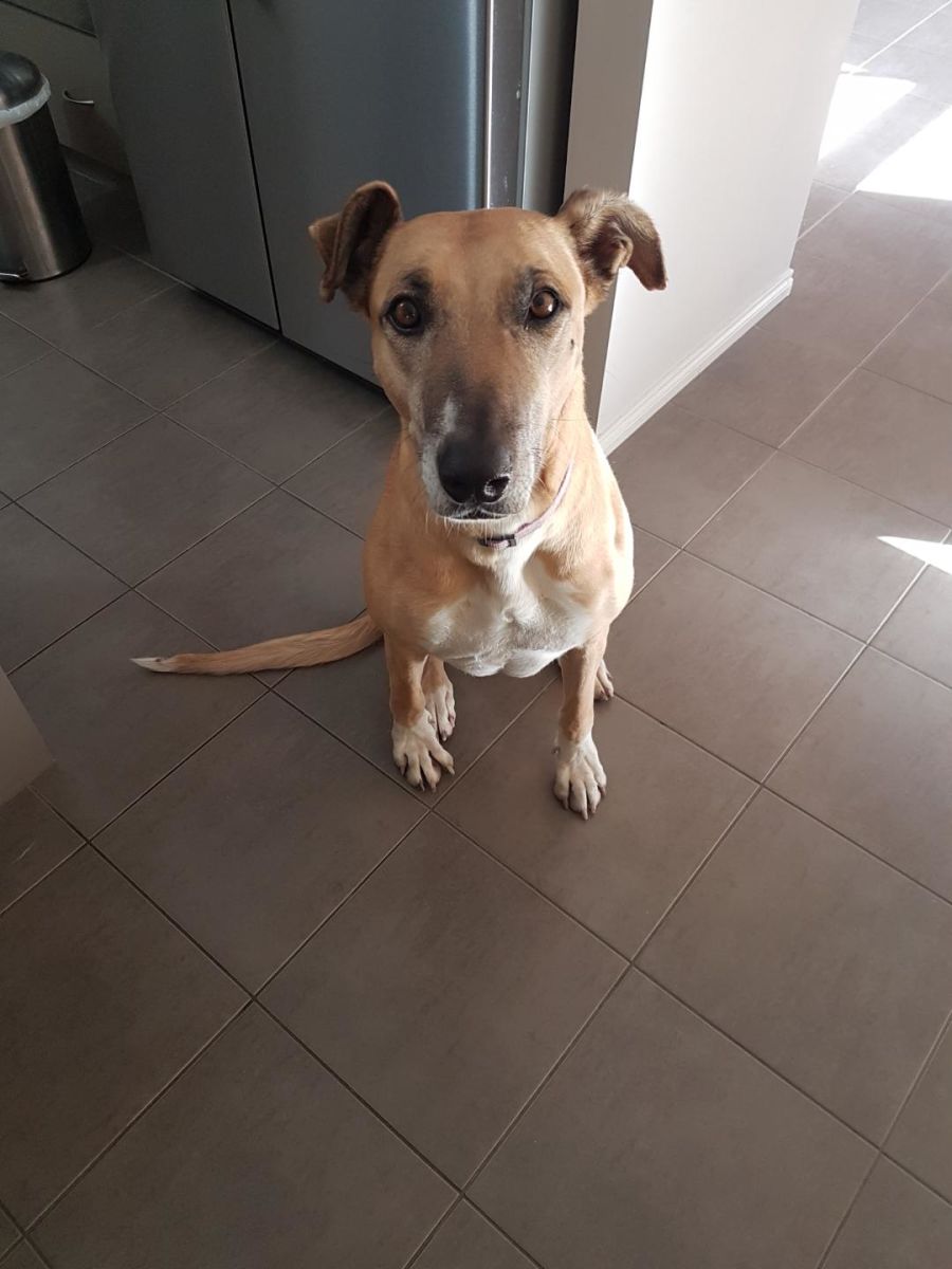 Sarah is a sweet happy delightful girl who loves people. She is good with children also, however she may knock small children over to lick them. Sarah is also ok with cats and doesn’t chase after them.