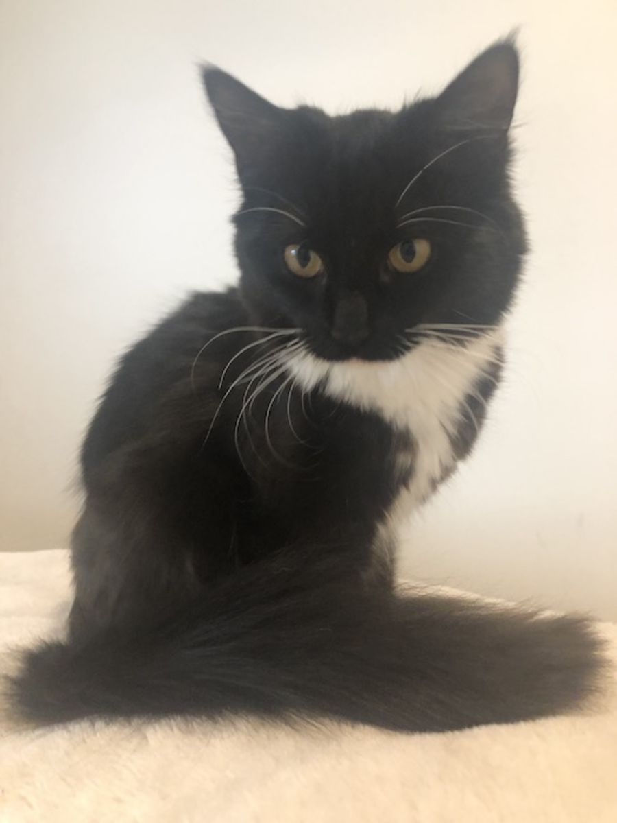 Oreo is a stunning black tuxedo cat with a bushy tail and an adorable personality.
