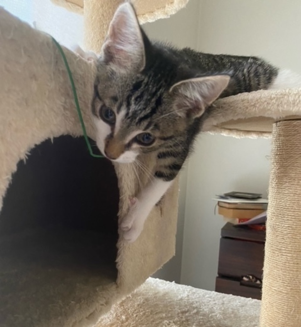 Meet Froggy, a delightful rescue kitten with an affectionate personality and a love for toys! He's always ready to play and loves back flips and aerial spins. After a good play session, Froggy is more than happy to curl up on your lap or perch on your shoulder and keep you company. He's also content to lounge around napping when you're not around.