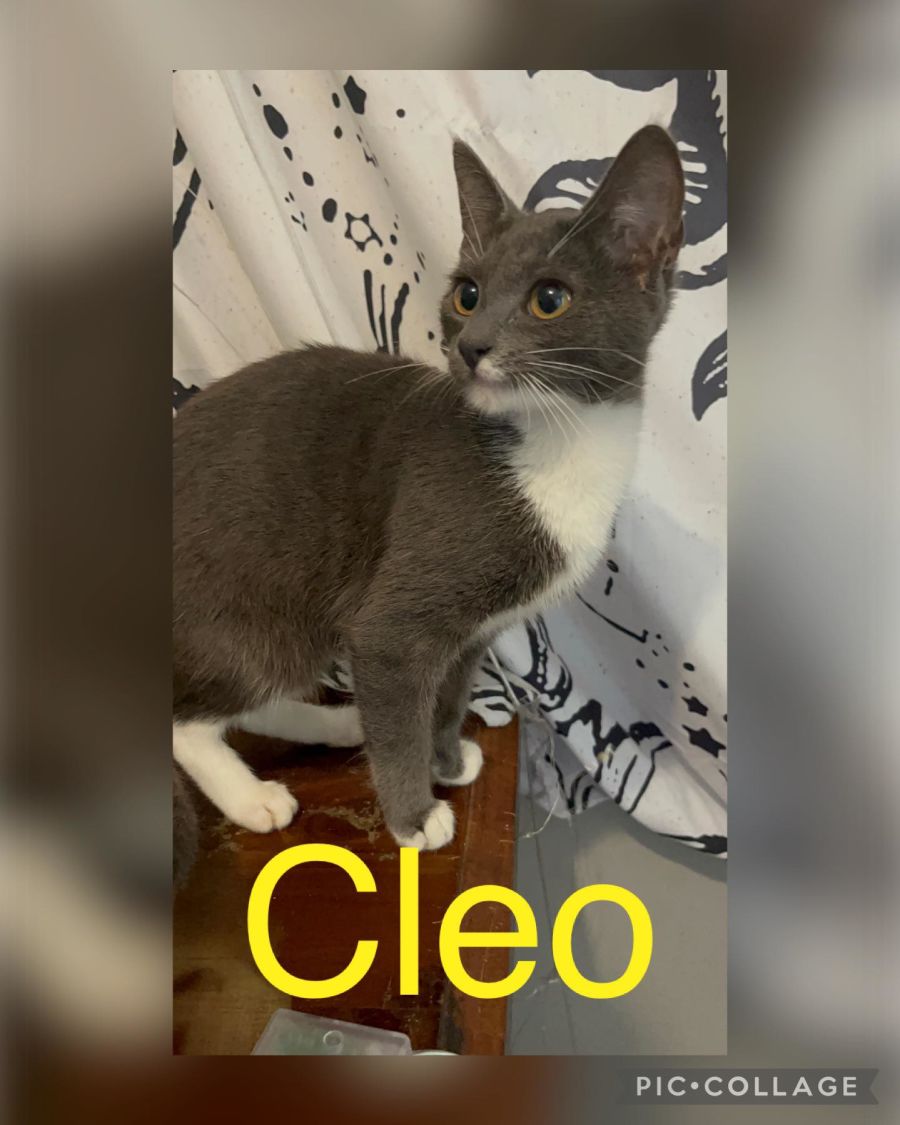 Cleo is a 5-month-old female kitten who loves to play and make people laugh. Grey and white in color, she has a cheeky personality that will keep you entertained for hours. She is always ready for some fun and games, whether it's chasing a string toy or getting up to mischief around the house!