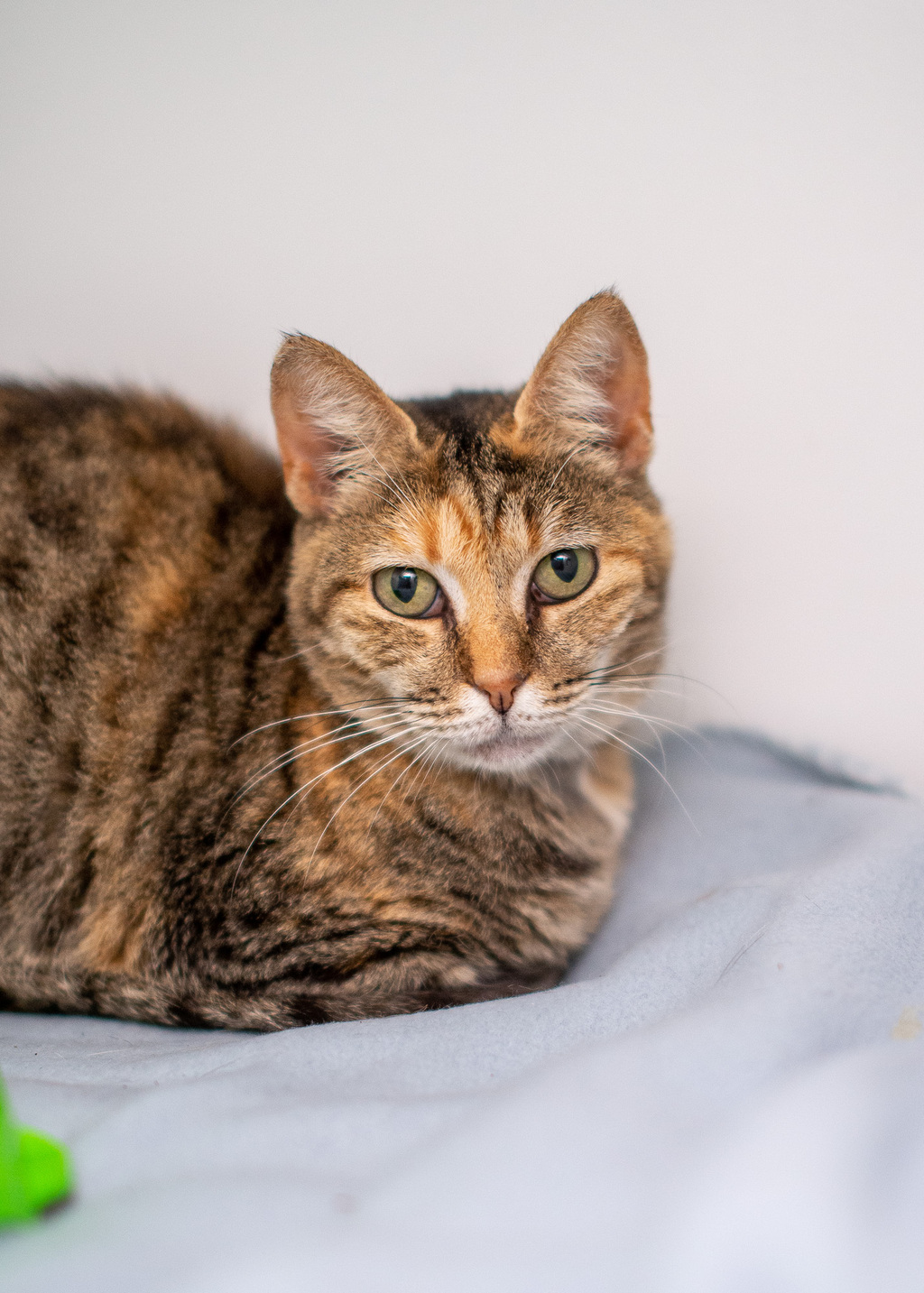 Honey Comb is a lovely older girl, sweet and cuddly. She is cat social with other quieter, calmer cats, as she lived with 2 others previously.