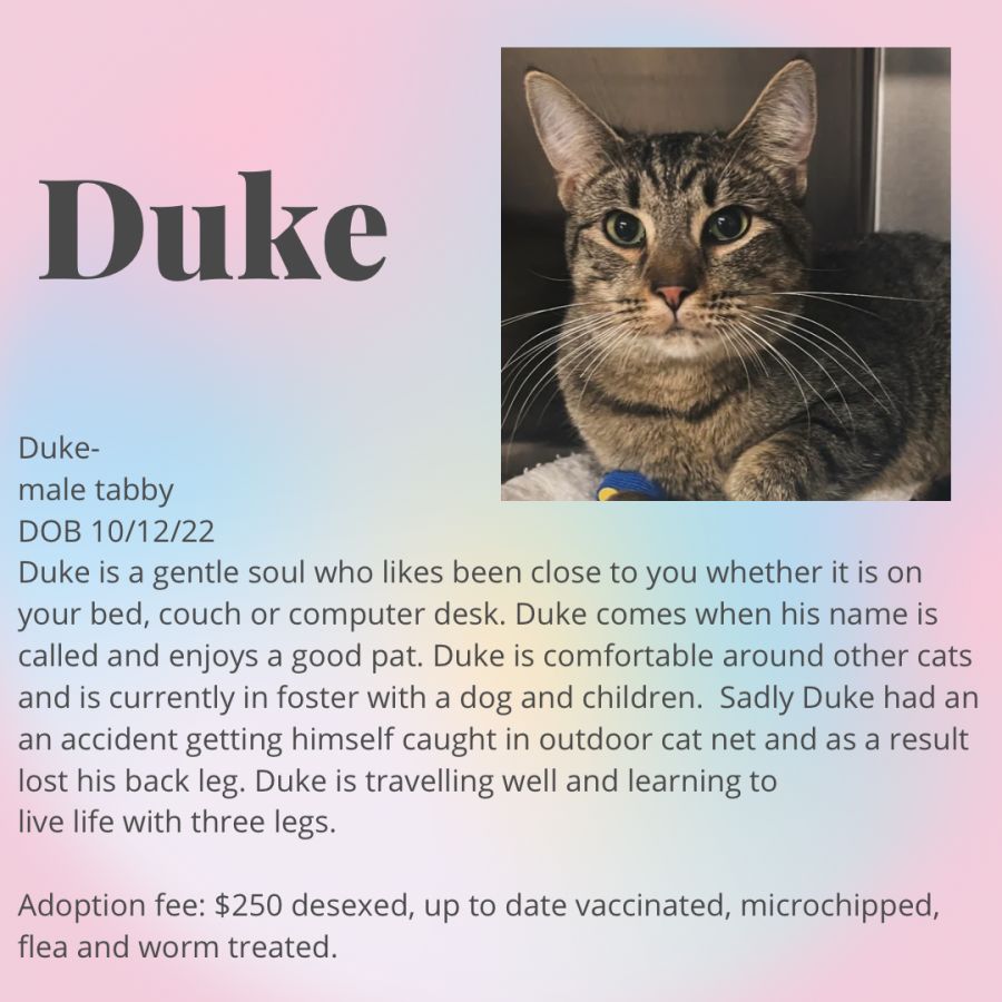 Duke enjoys a good pat and cuddles. He is shy boy so we would need a home who understands that going slow will ultimately mean gaining a friend for love.