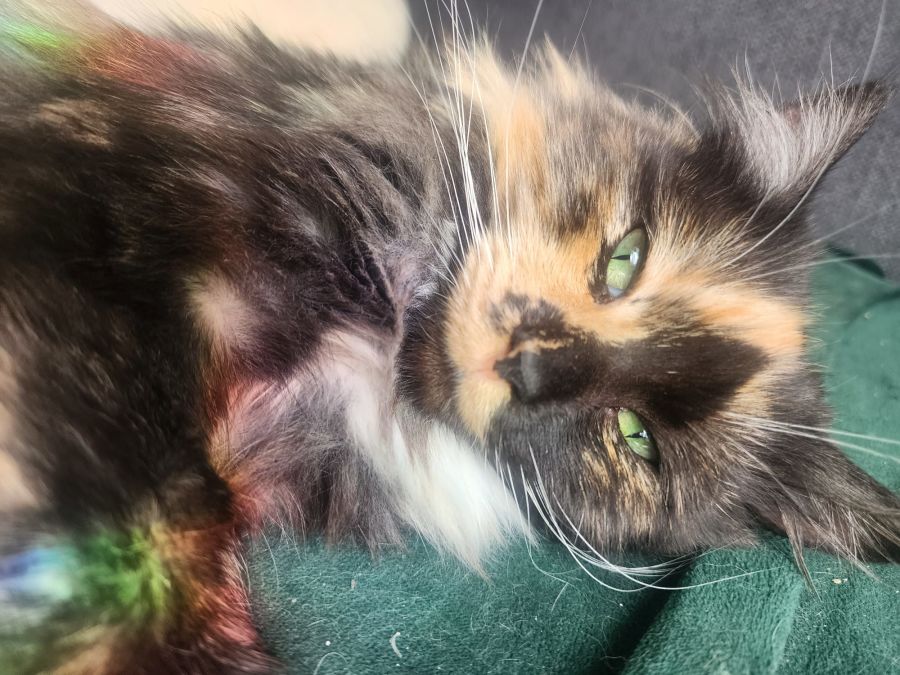 Apple loves her sister wife cat Chrissy and large foster cat family so will be fine with another cat. She is gentle so with an appropriate introduction, she should be fine with dogs and small children