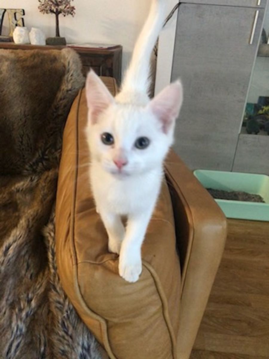 Kenzie is an inquisitive and playful male cat who loves to be around people. His beautiful white coat and striking blue eyes will have you mesmerized!