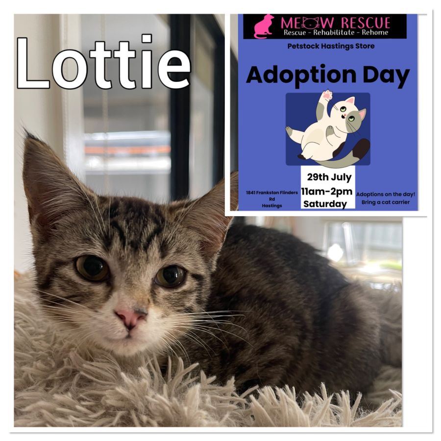 I will be available for adoption on the day 29/7/23 Saturday 11am-2pm at Hastings petstock store. Come and meet her, chat with our Meow team about adopting on the day. Bring a carrier or buy one in store. Adoptions on the day to the most suitable applicant for Lottie.