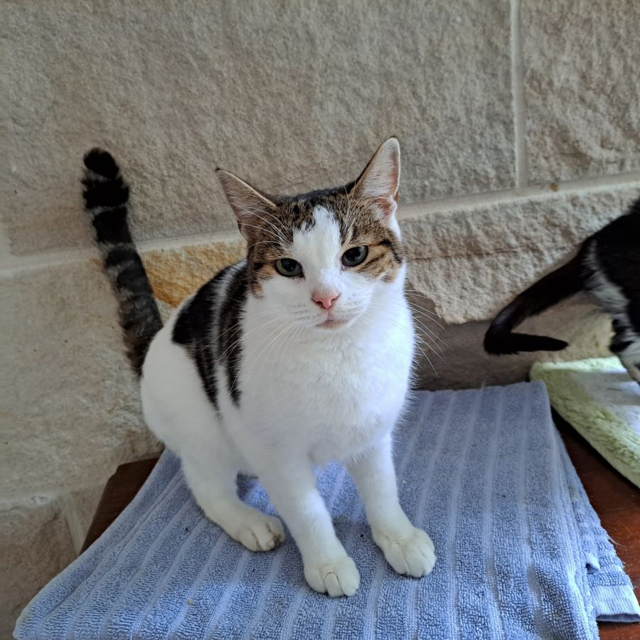 Arches her neck for a title and to be swept up into my arms. Very affectionate little adult cat aged around 1 year.