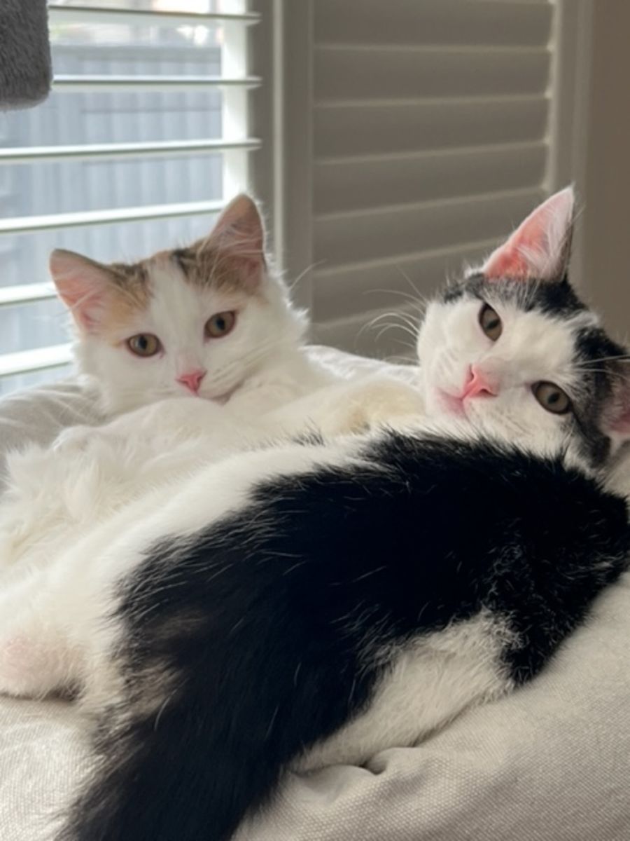 These smoochers came into care after living in a kind man’s back yard. He fed them and tried to teach them that humans are good. These beauties are a little more reserved than your average kittens but still love affection and getting up to maximum mischief. Julius regularly asks for lap time and purrs in thanks. Nicole is beginning to enjoy petting and purrs but is still learning to trust.
