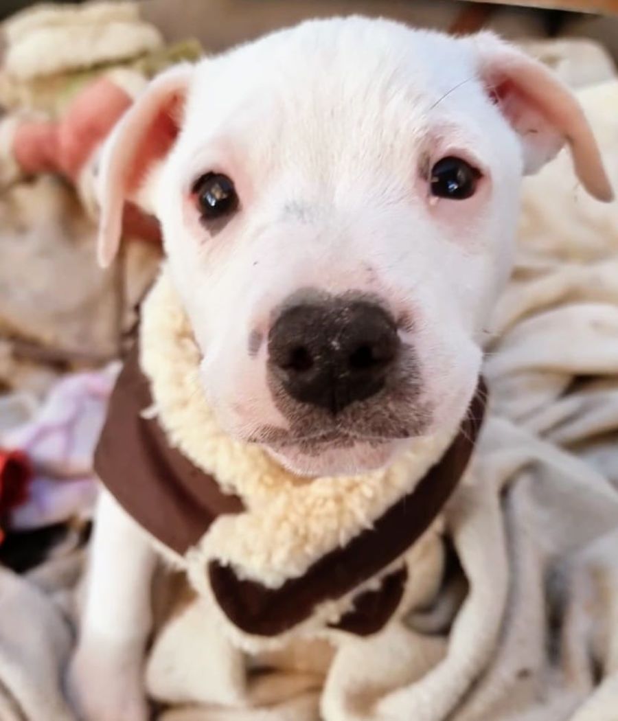 Bana is a sweet and cuddly pup who loves to snuggle up under your chin. He is a runt, so he is small in size, but that doesn't stop him from having big love to give. Bana would do best with another gentle doggy friend, as it will help him grow in confidence. When outside, sun smart practices are a must since his coat is mainly white. Bana is the ultimate love bug and would make an excellent companion for any family.