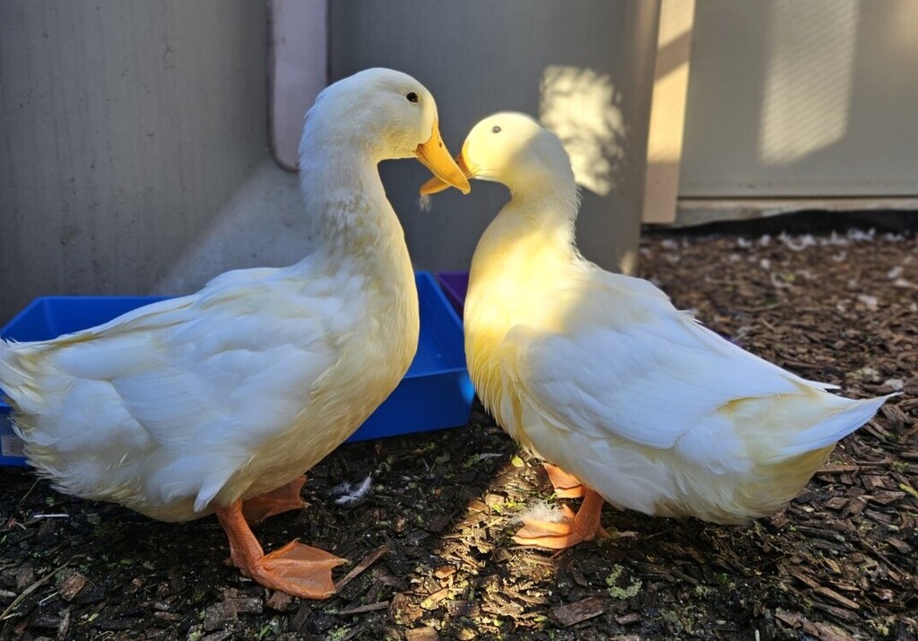 Meet Puffling, the female half of the bonded duck duo with Fuzzling. The pair are very friendly and easy to handle when needed. The pair have discovered how fun their paddle pool is and can be found napping in it, even in this cold weather. These guys are very familiar with people as they'll cry out if they can hear you feeding anyone else that is not them. They are rather large for their age and have changed in colour so quickly going from the tiny, yellow, fuzzy babies to large, confident, white feathered young adults.
