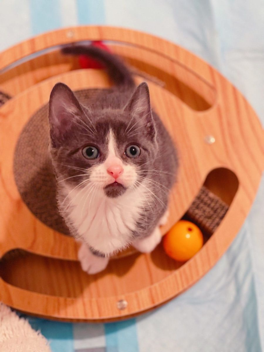 He entertains himself with lots of toys and loves human cuddles