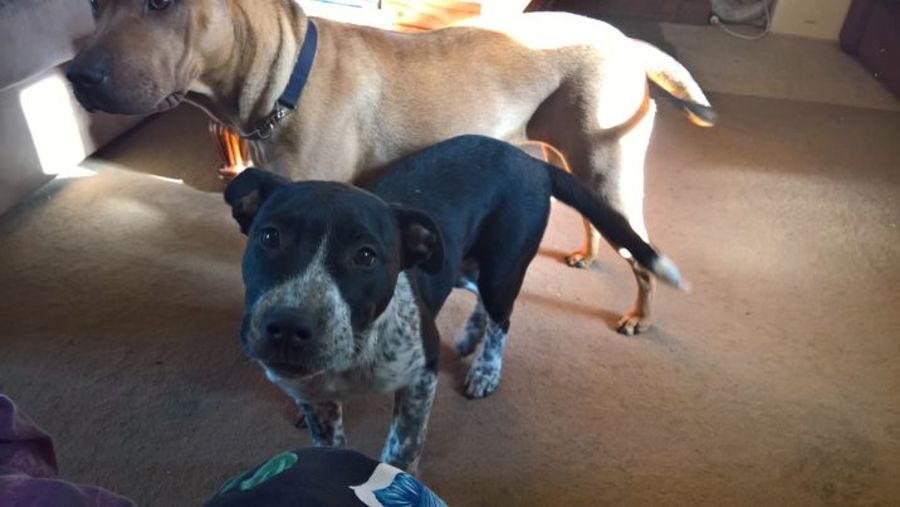 We believe Poppy may be a Staffy/Cattle Dog mix but exact breed is unknown.