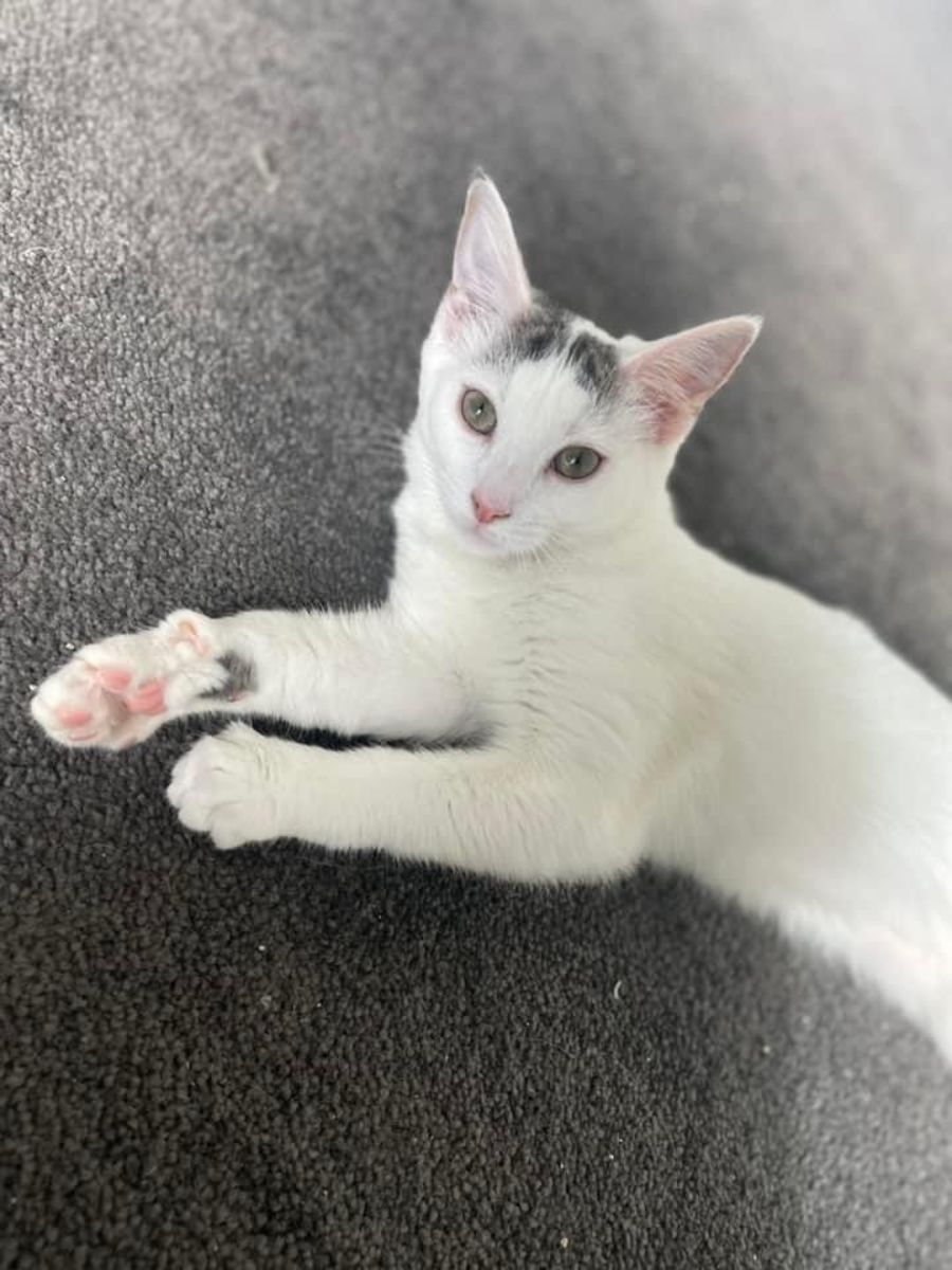 Sprout is a domestic shorthair who loves playing and snuggling with her siblings. With humans, this gorgeous snowy white and grey bi-colour is more of an observer at first. Yet once she has warmed up to you, she enjoys pats, chin scratches and cuddles.