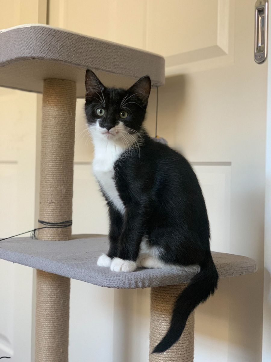 A sweet male kitten who loves to play and cuddle. He is an outgoing little guy who loves nothing more than to climb on your chest and sleep. He is always up for a game of chasing the laser or batting around a toy on a stick. Not only does he love to play, but he also loves to chat! He will meow, purr, and chirp away until you can't help but smile.