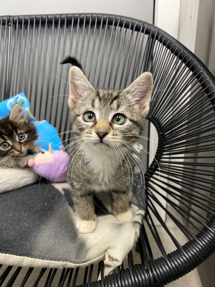 Rezz is a 9 week old Female Tabby & White Domestic Short Hair Kitten who is ready to find her forever home! Rezz is an outgoing and independent young girl, but can be a bit timid at first. Once she gets to know you though, she loves nothing more than a good chin scratch! Plus, she's absolutely gorgeous with her tabby markings and her unique crossed eyes.