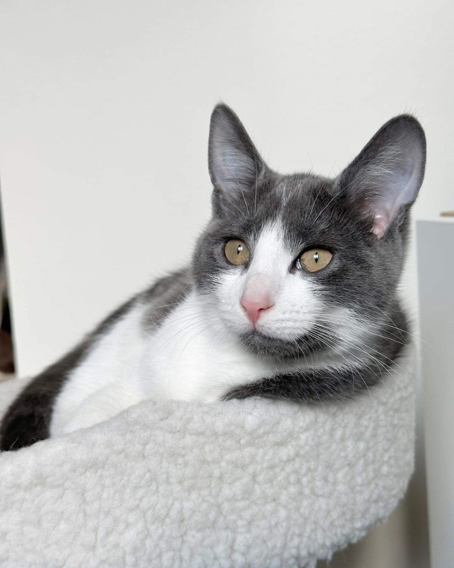 Comet is a grey and white domestic short hair with beautiful orange eyes. He has been a little firecracker since the day he came into foster care. He is a charming ball of energy who loves to play, chase his toys and wrestle with his sister Astrid. His favourite toy is the “fishing rod” and he would chase it forever if he could. He is a bit bigger than his sister and loves to jump out and scare her from behind furniture. He earnt his name as he understands speed and zooms about the house but I’m not quite sure if he understands how to break because he crashes into almost every surface in his path! He is not the brightest but what he lacks in brains he makes up for in love, cuddles and kisses!