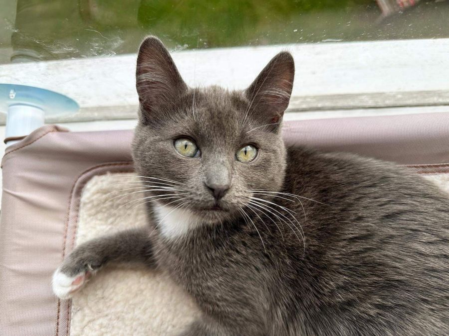 Astrid is a gorgeous grey kitten with stunning green/blue eyes, a white patch on her chest, white mittens and white socks on her back legs. She has the softest fur.
