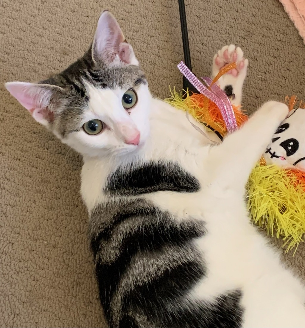 This sweet kitten loves the company of people and will almost turn herself inside out to get your attention. She will reward you with a big purr and lots of cuddles.
