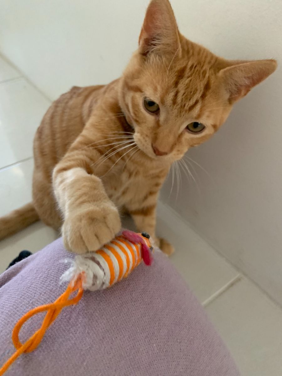 He loves to play and his favorite toy is an orange mouse he often carries around the house. He likes to hide the toys under the bed.